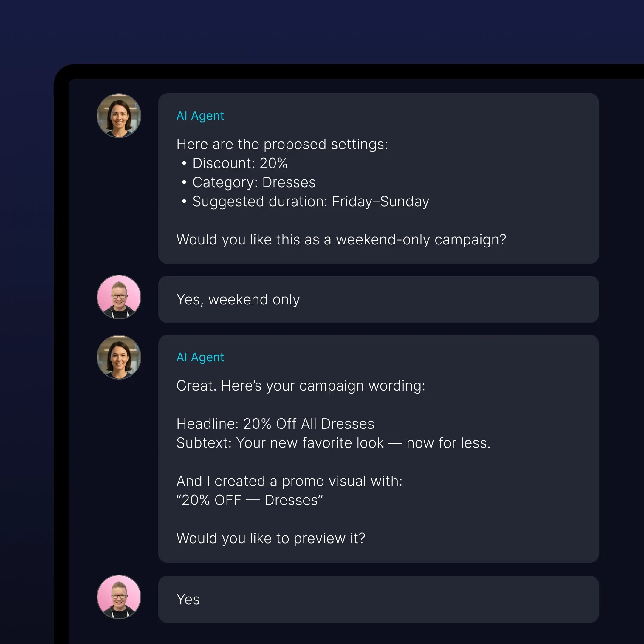 Turn those answers into action. Work side-by-side with your agent to plan campaigns, pricing strategies, or product updates.